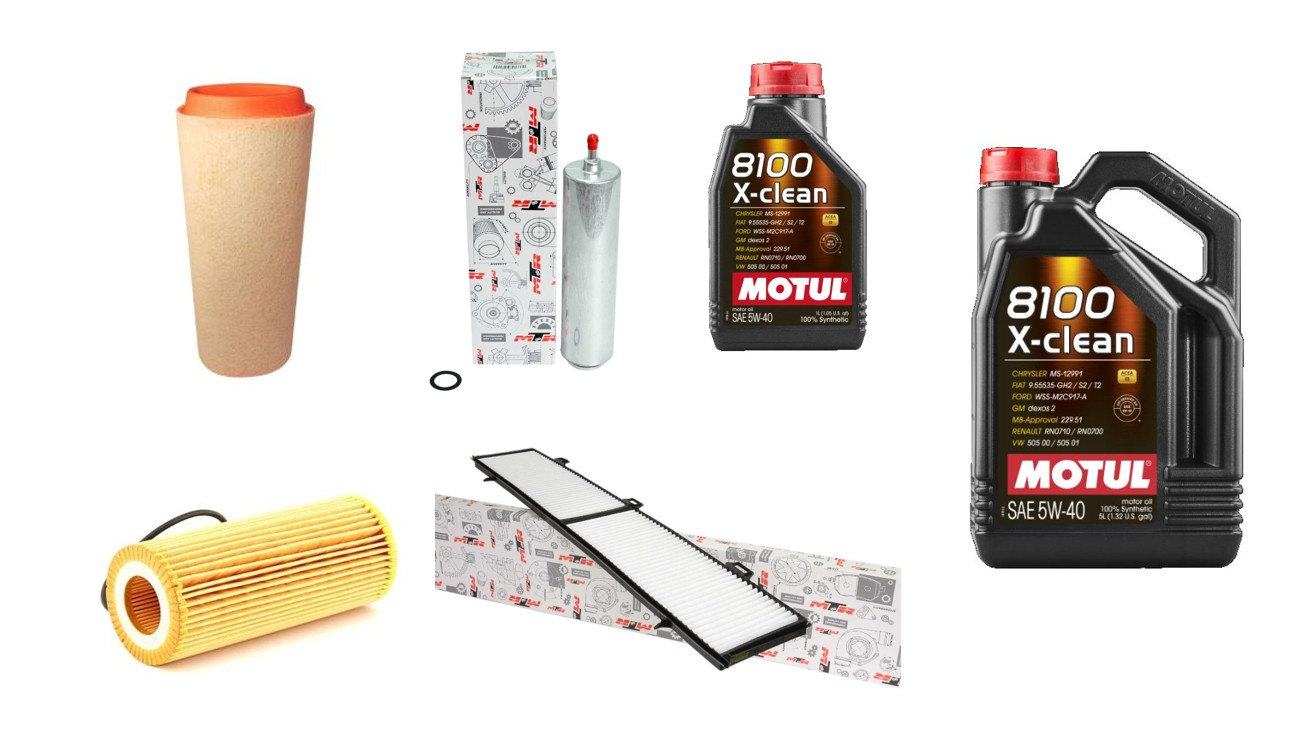 Kit-ul cuprinde urmatoarele piese: filtru de ulei MTR - 12138266 filtru de aer MTR - 12138317 filtru de combustibil MTR - 12138315 filtru de habitaclu MTR - 12135379 ulei motor MOTUL 8100 X-CLEAN 5W-40 6L Pentru verificarea compatibilitatii este necesar sa treceti seria VIN in comanda.