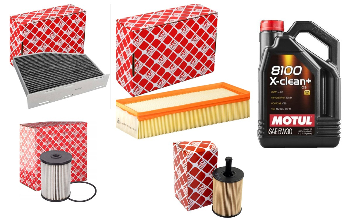 Kit-ul cuprinde urmatoarele piese: filtru de ulei FEBI BILSTEIN - 22546 filtru de aer FEBI BILSTEIN - 22552 filtru de combustibil FEBI BILSTEIN - 38864 filtru de habitaclu FEBI BILSTEIN - 105789 ulei motor MOTUL 8100 X-CLEAN+ 5W-30 5L Pentru verificarea compatibilitatii este necesar sa treceti seria VIN in comanda.